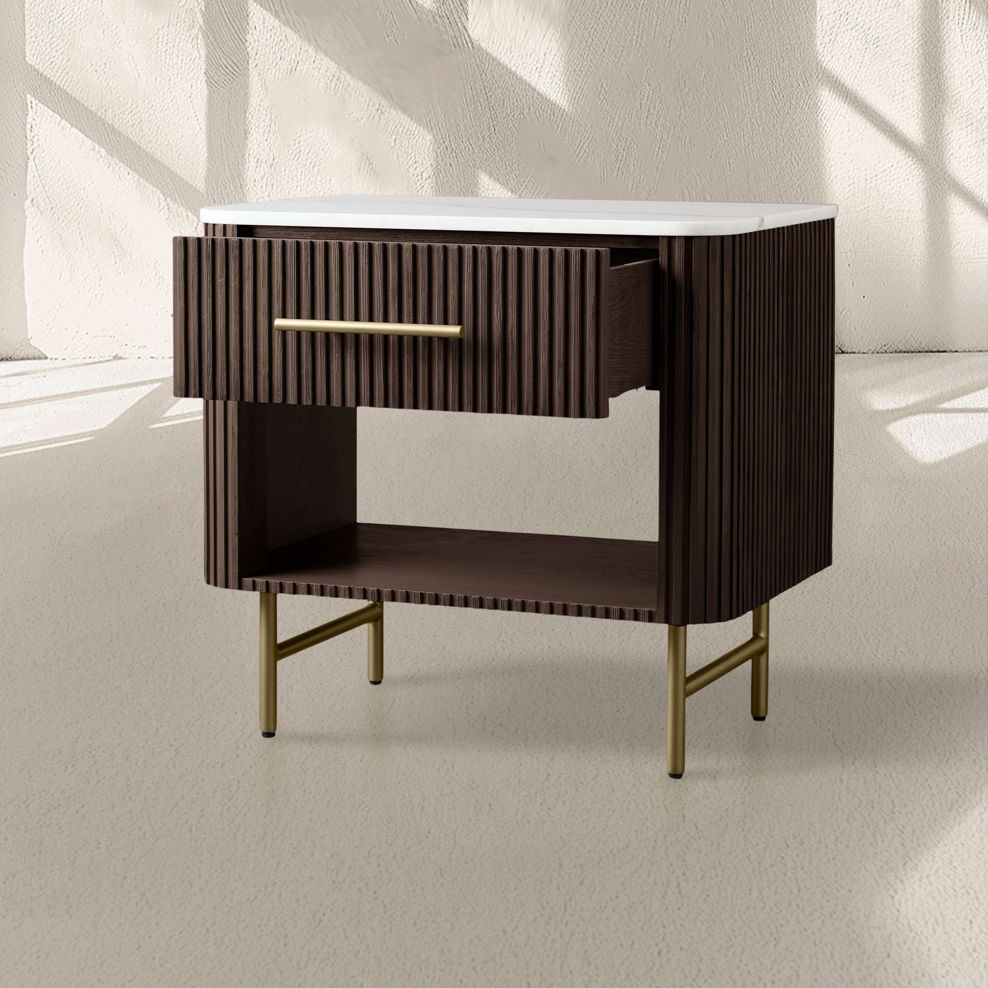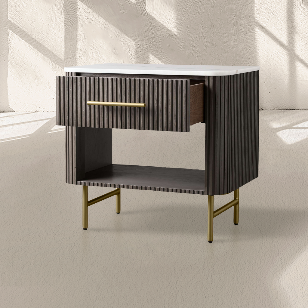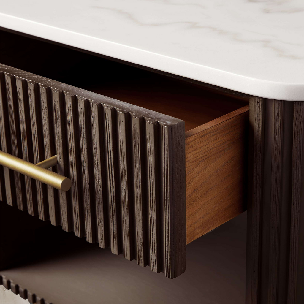 The wood surfaces are hand-stained with a rich finish and protected with a lacquer for a subtle sheen. Zinc-alloy hardware with a brass finish adds an elegant touch.