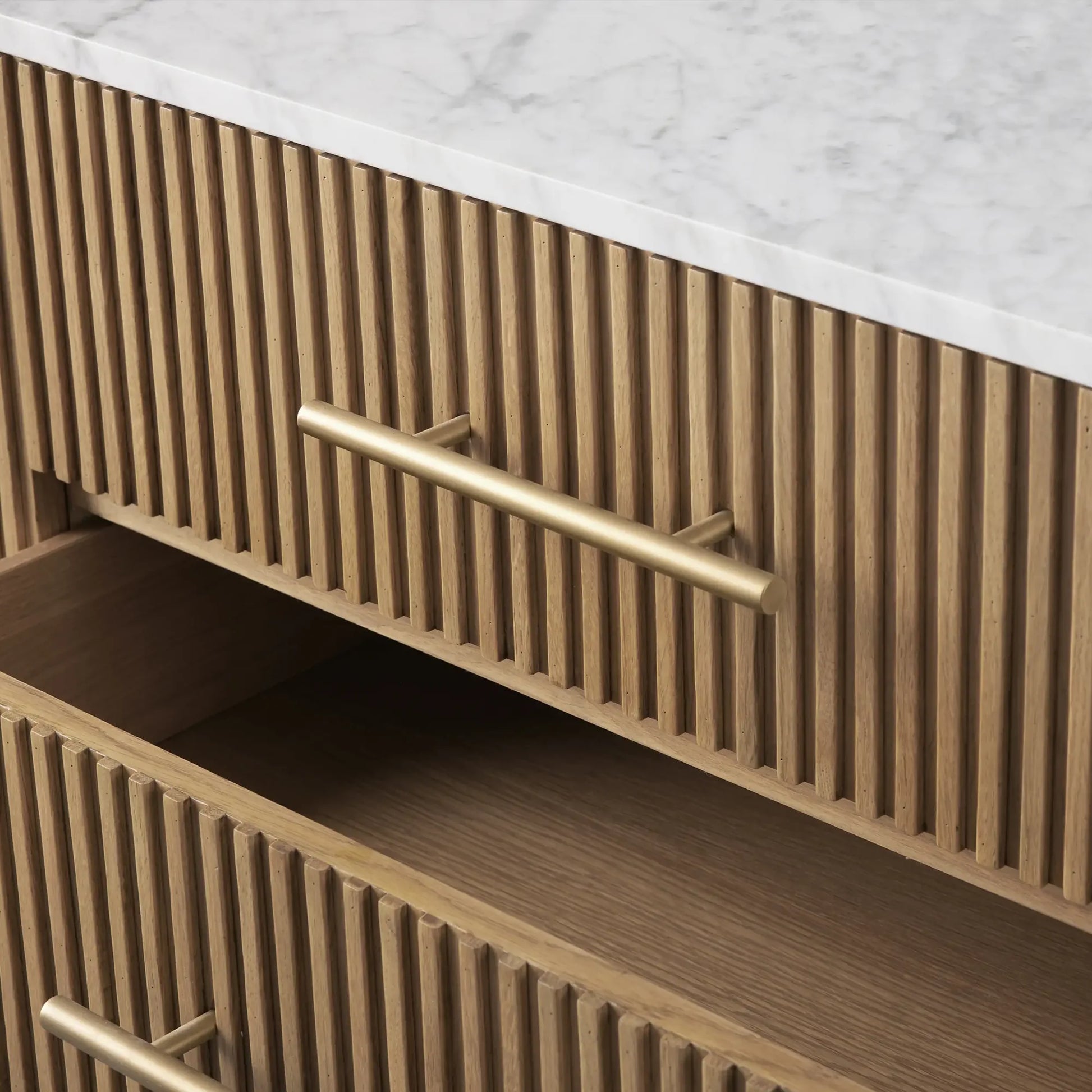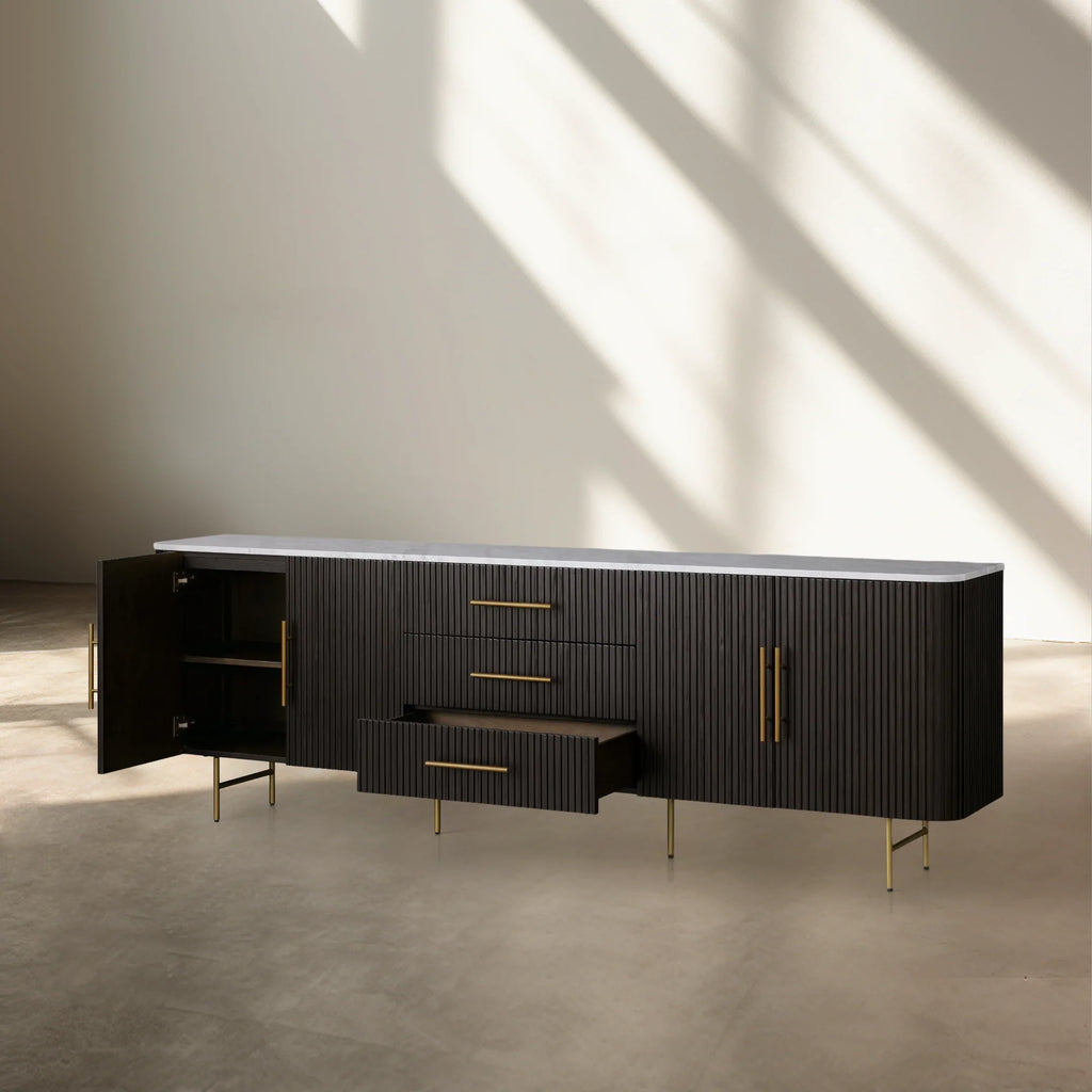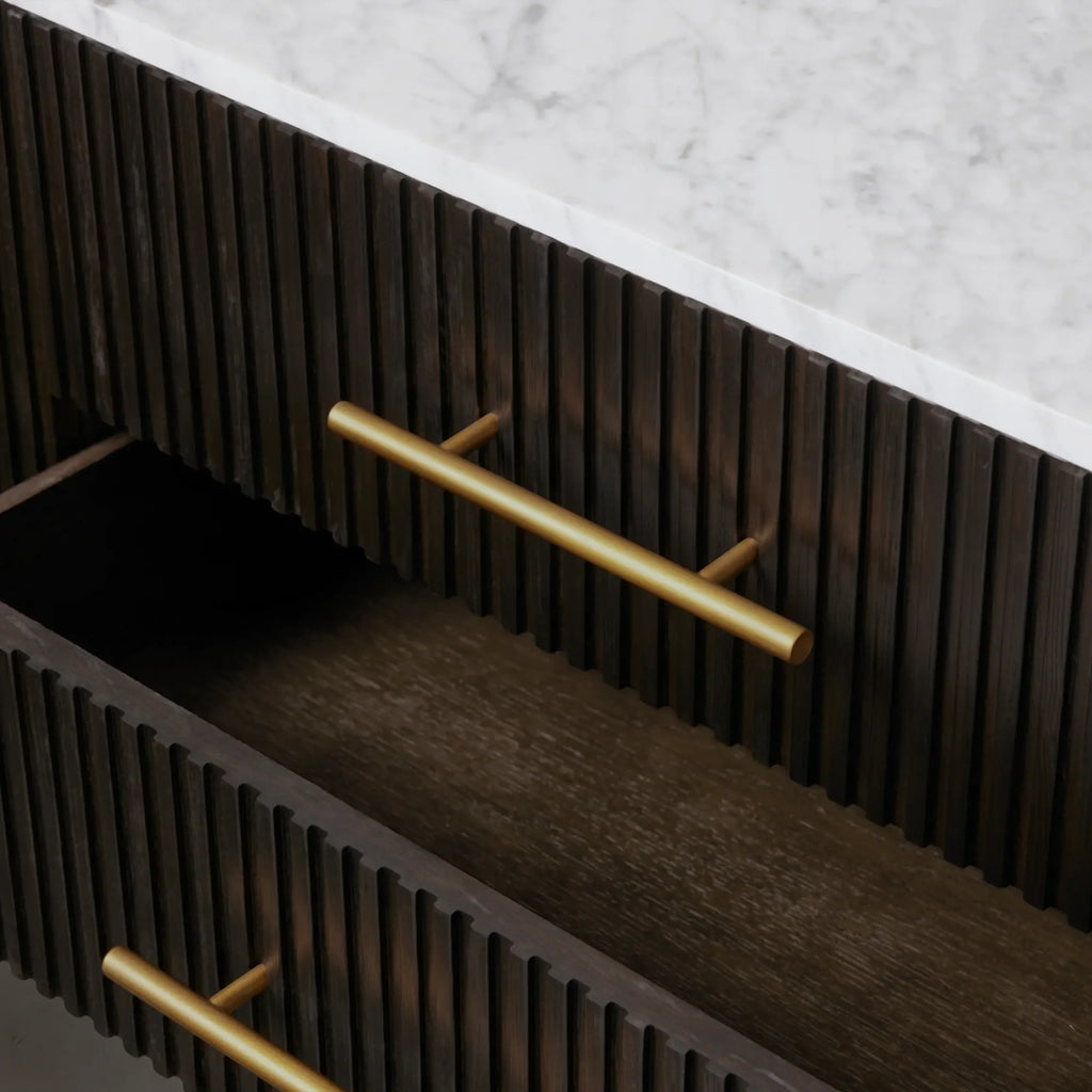 Our Finnley Collection showcases a stunning mixed-material design, inviting elevated style into your dining space. Hand-finished pine from Finland or white oak wood is luxuriously complemented by a stone top, accented by brass hardware and reeded oak detailing. The result is an eclectic-yet-chic collection perfect for gatherings that linger long into the night.