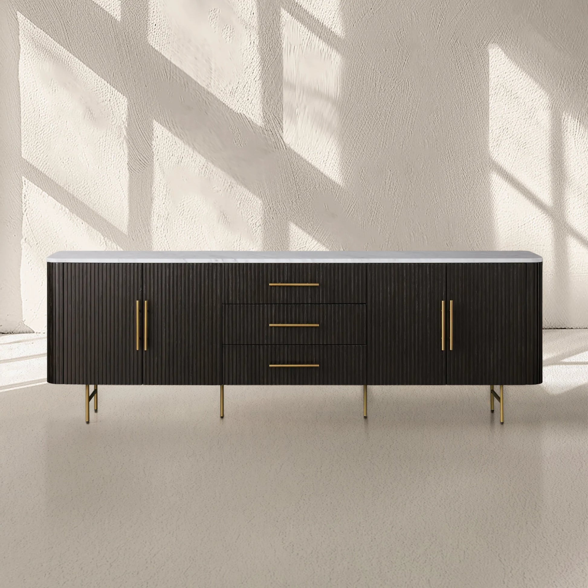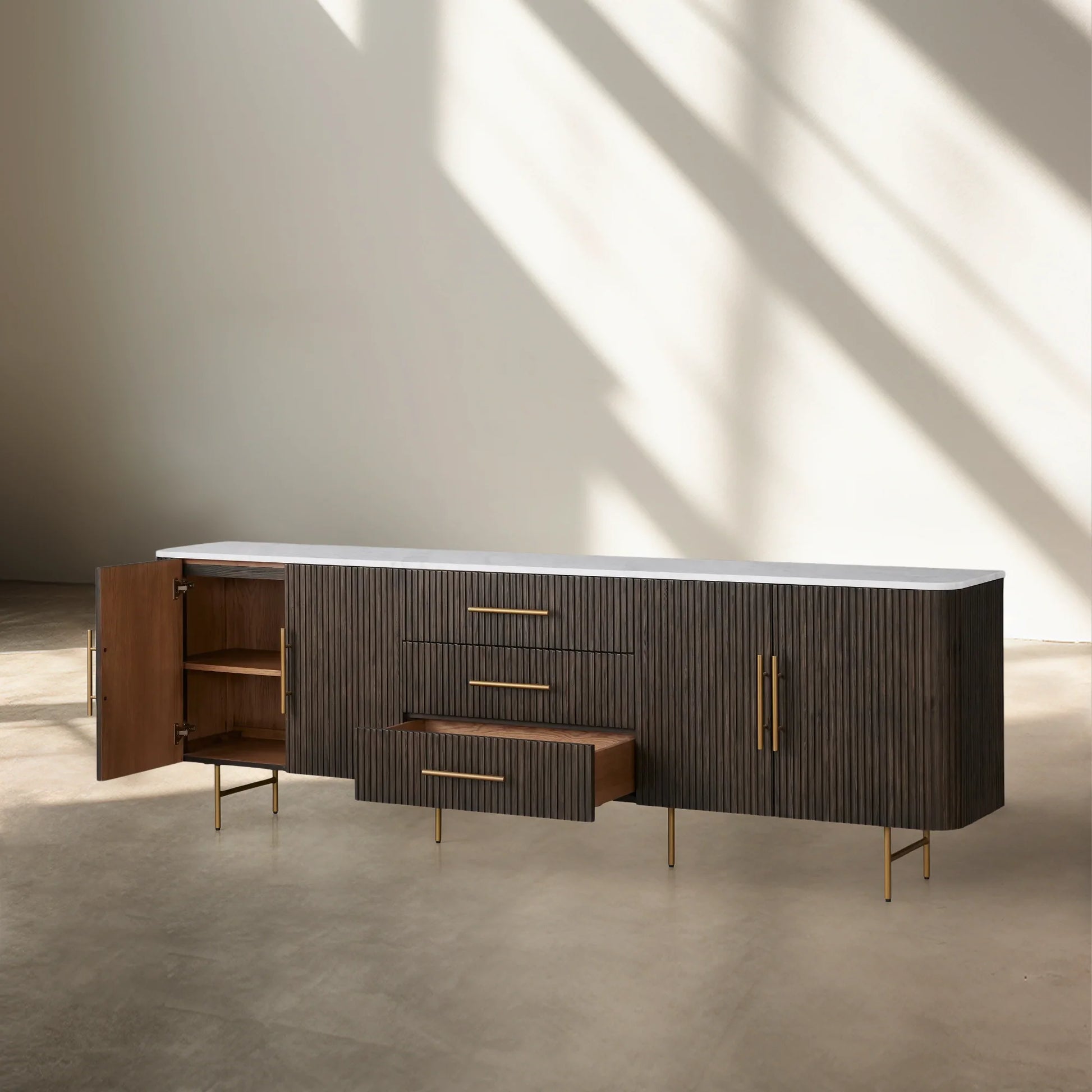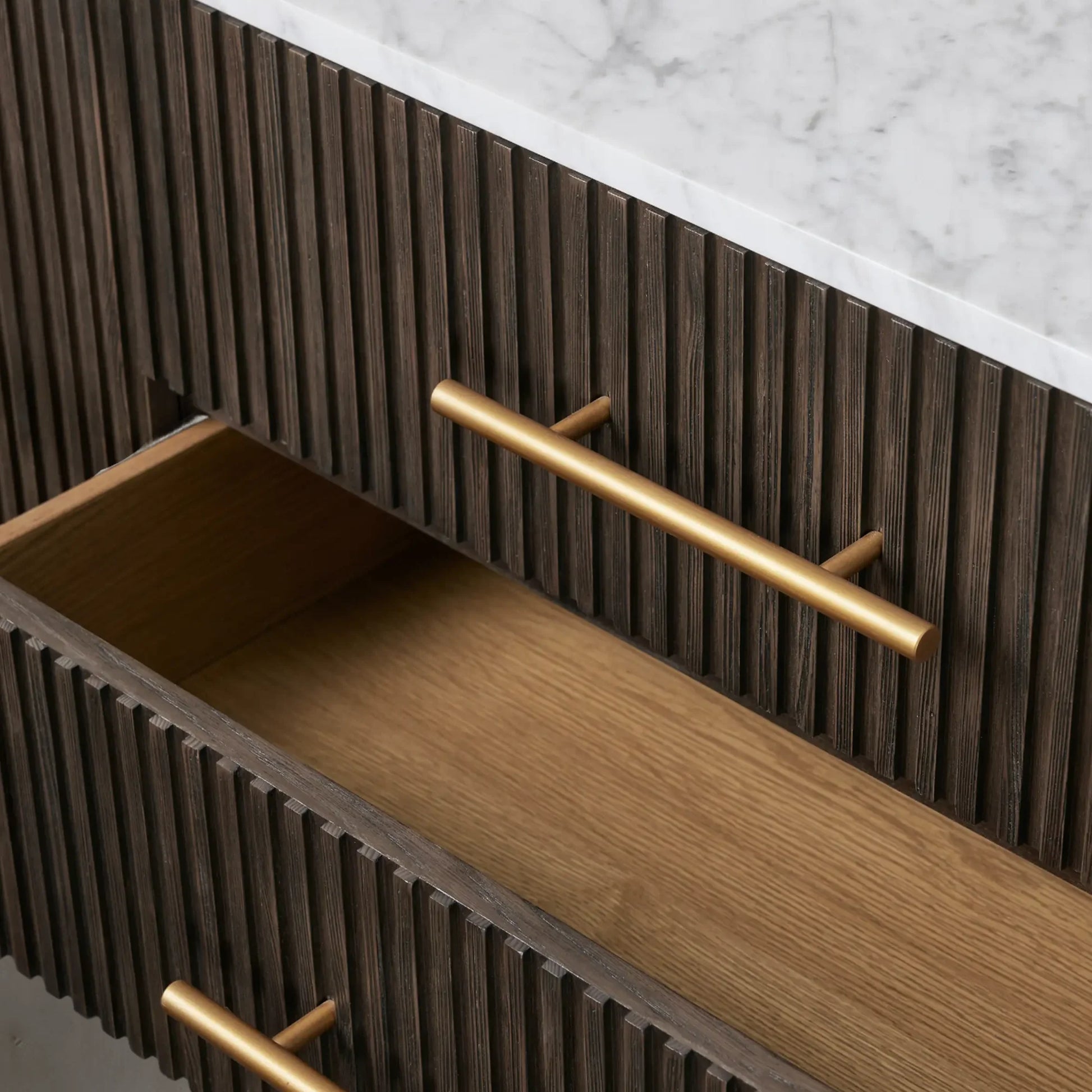 Our Finnley Collection showcases a stunning mixed-material design, inviting elevated style into your dining space. Hand-finished pine from Finland or white oak wood is luxuriously complemented by a stone top, accented by brass hardware and reeded oak detailing. The result is an eclectic-yet-chic collection perfect for gatherings that linger long into the night.