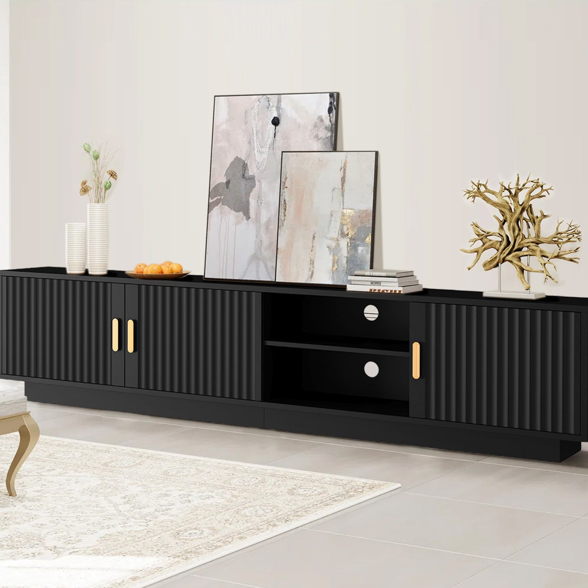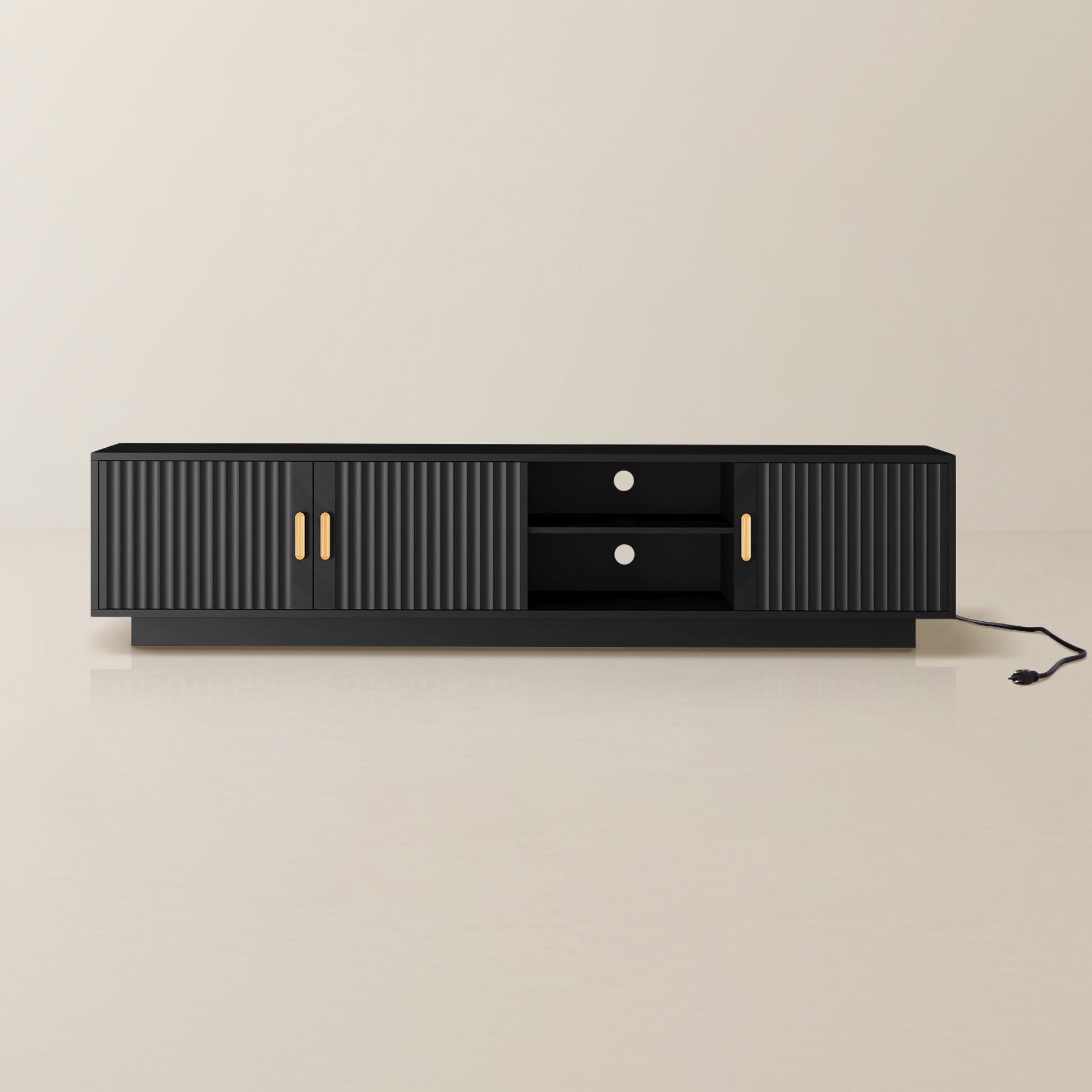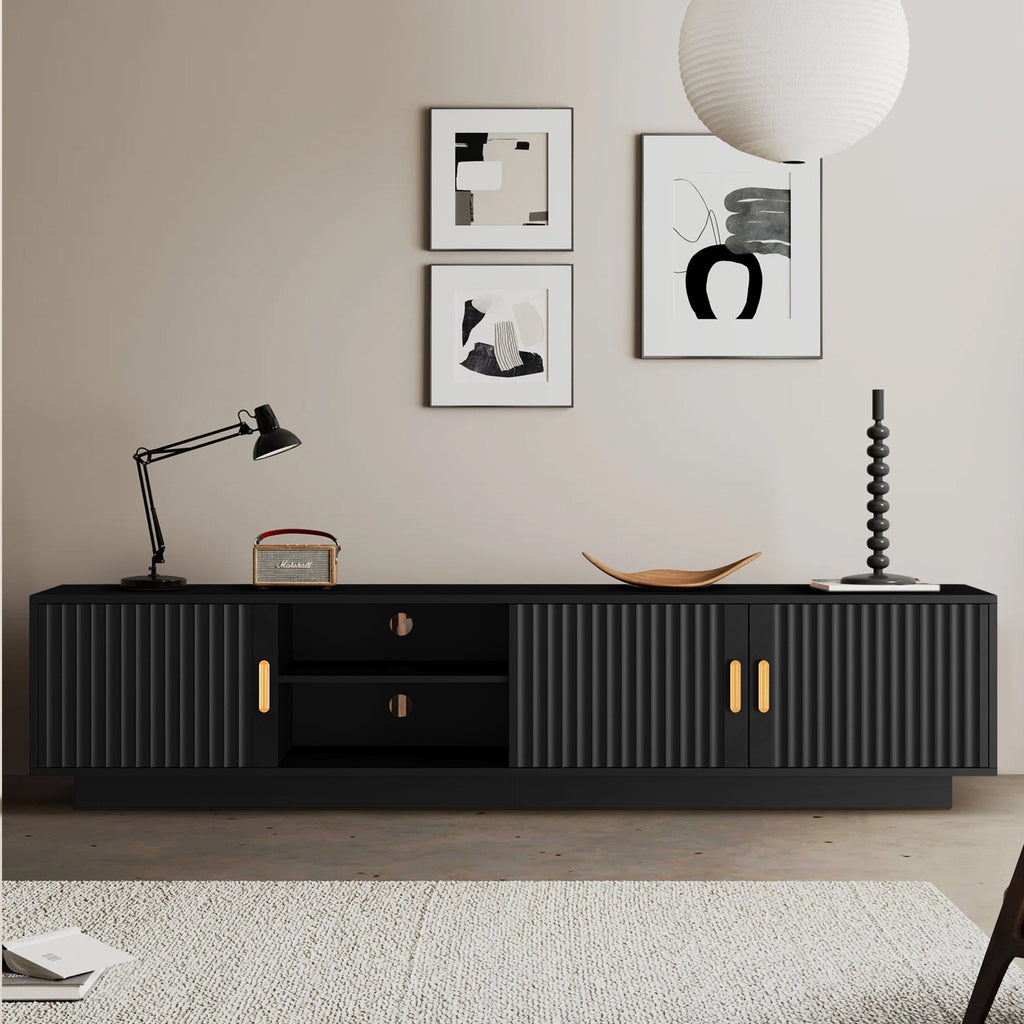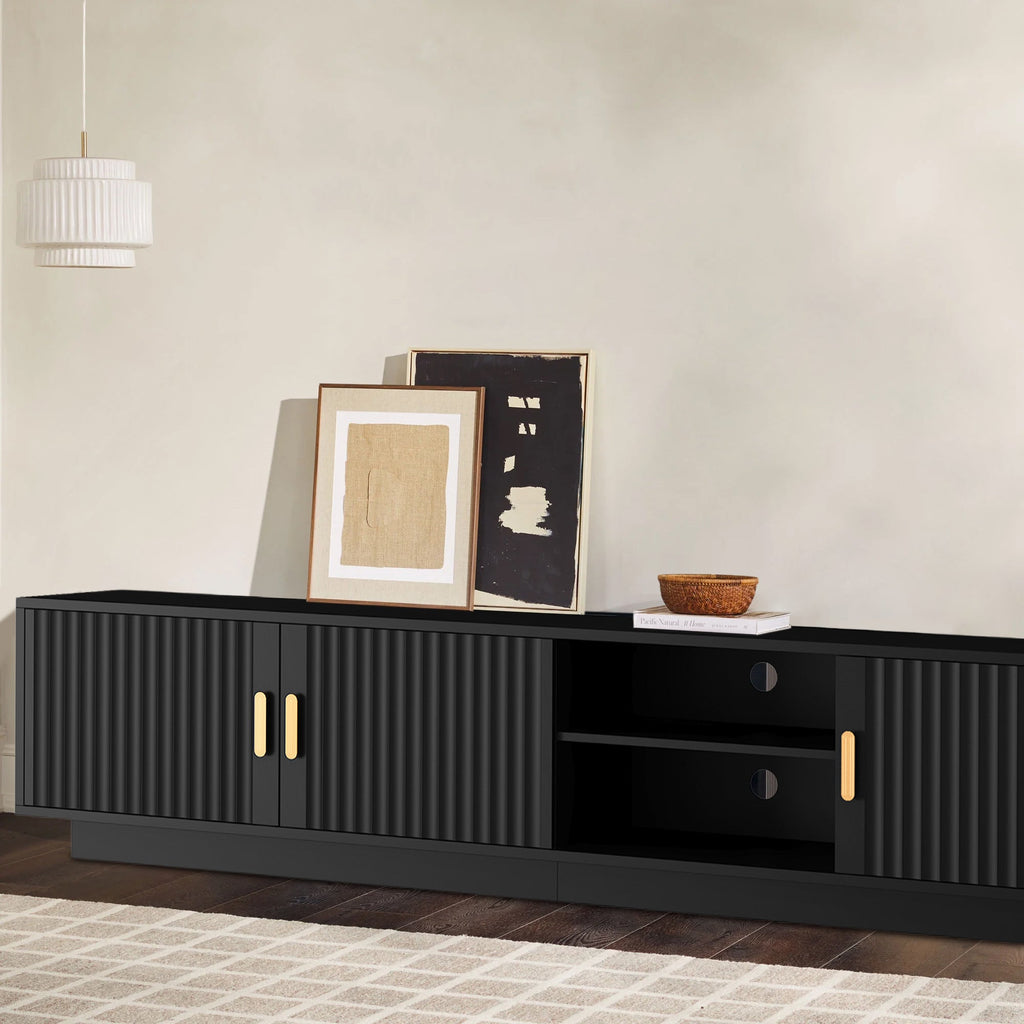 Featuring a smooth fluted top and blonde woodgrain legs, this TV stand exudes luxury and elegance, complementing a variety of modern furniture styles.
