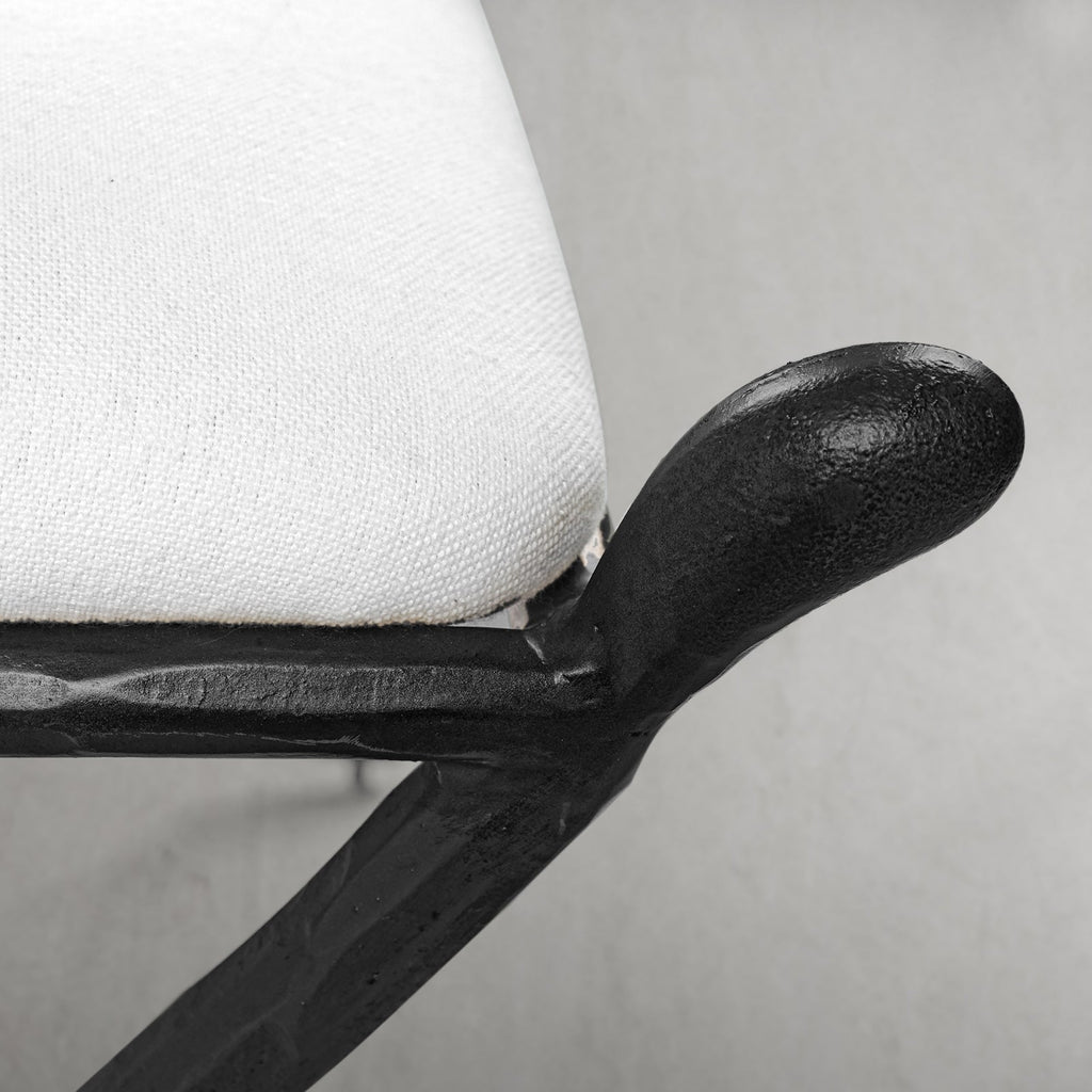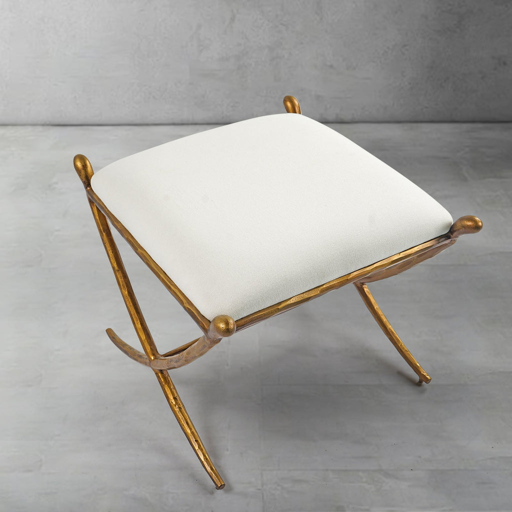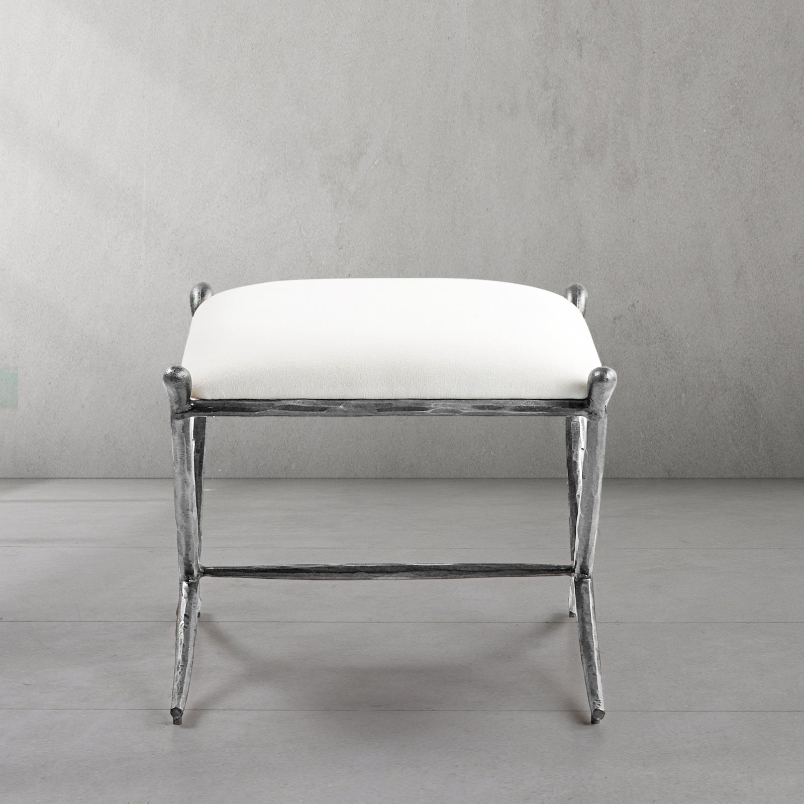 Our Stools from the rustic sensibility of a hand-forged metal base with tailored upholstery. Employing an ancient fabrication process, artisans hand hammer the metal bars to reveal an alive, imperfect and organic texture, a counterpoint to the frame's slender, tapered silhouette.