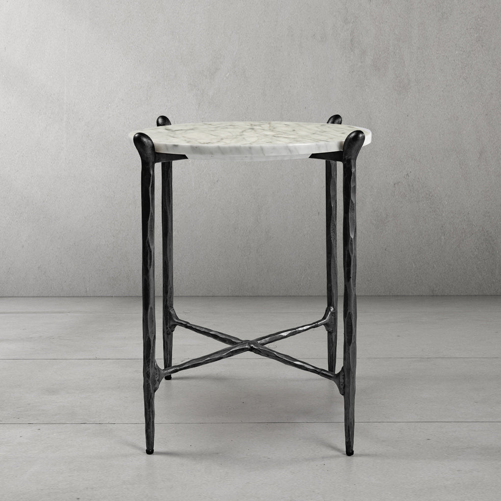 Our collection by the rustic sensibility of hand-forged metal with cool Italian marble. Employing an ancient fabrication process, artisans hand hammer the metal bars to reveal an alive, imperfect and organic texture. The pounded, tapered silhouettes are a rich counterpoint to the smooth, honed stone.