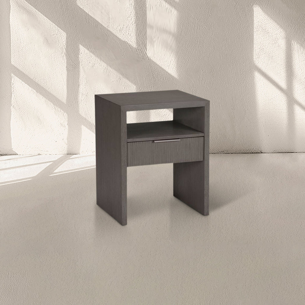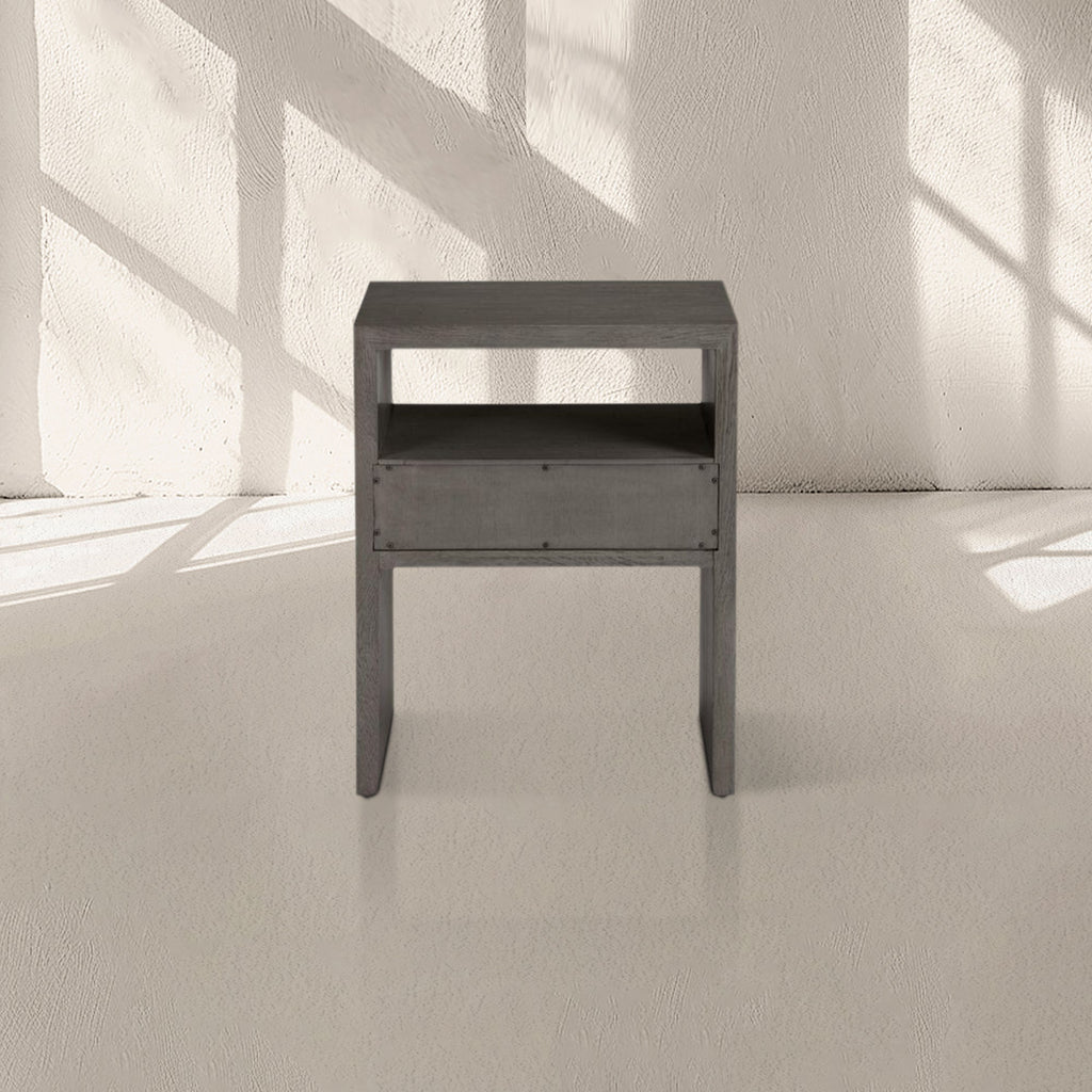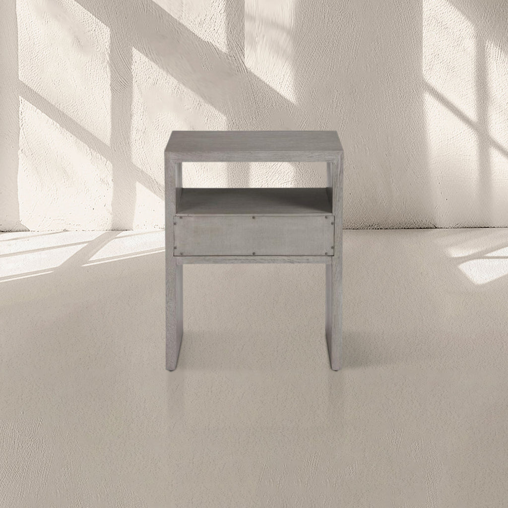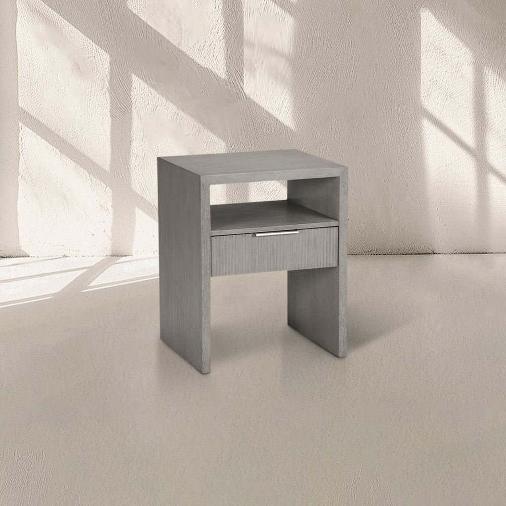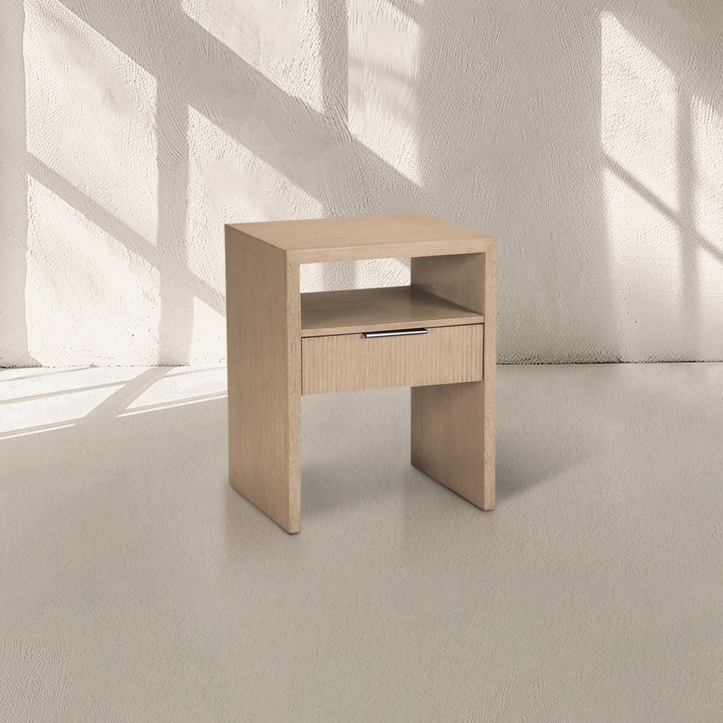 The Verlpo Small Night Table is a compact yet highly functional piece designed to elevate your bedroom with its thoughtful details. Featuring an open shelf for easy access to bedtime essentials like books or a phone, it also includes a discreet storage drawer with a beautifully reeded front, adding texture and visual interest. Crafted from oak with a prominent, hand wire-brushed grain, this night table showcases artisanal craftsmanship. Its petite size makes it ideal for any space, while its practical design ensures it meets your storage needs with effortless style. A perfect blend of form and function, the Verlpo Small Night Table is a charming addition to your bedroom.